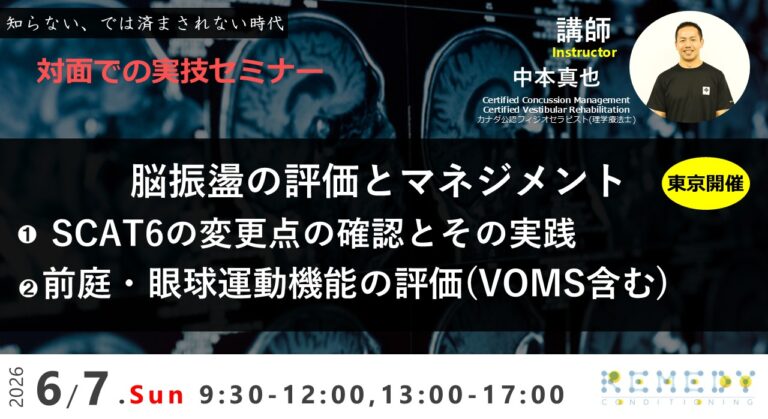 対面実技セミナー「脳振盪の評価とマネジメント」東京開催 6月7日(日) 一番の目的は、脳振盪の評価のスキルを磨くこと。 そして、当日は実技に集中するため、実技で得た知識・スキルを活かすために、 … 続きを読む 対面実技セミナー「脳振盪の評価とマネジメント」2026/6/7